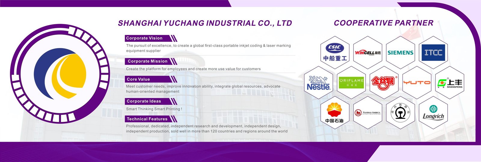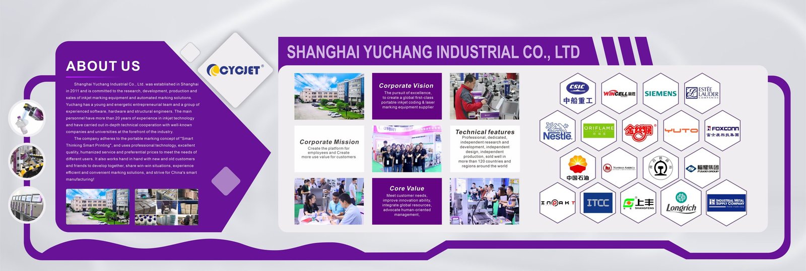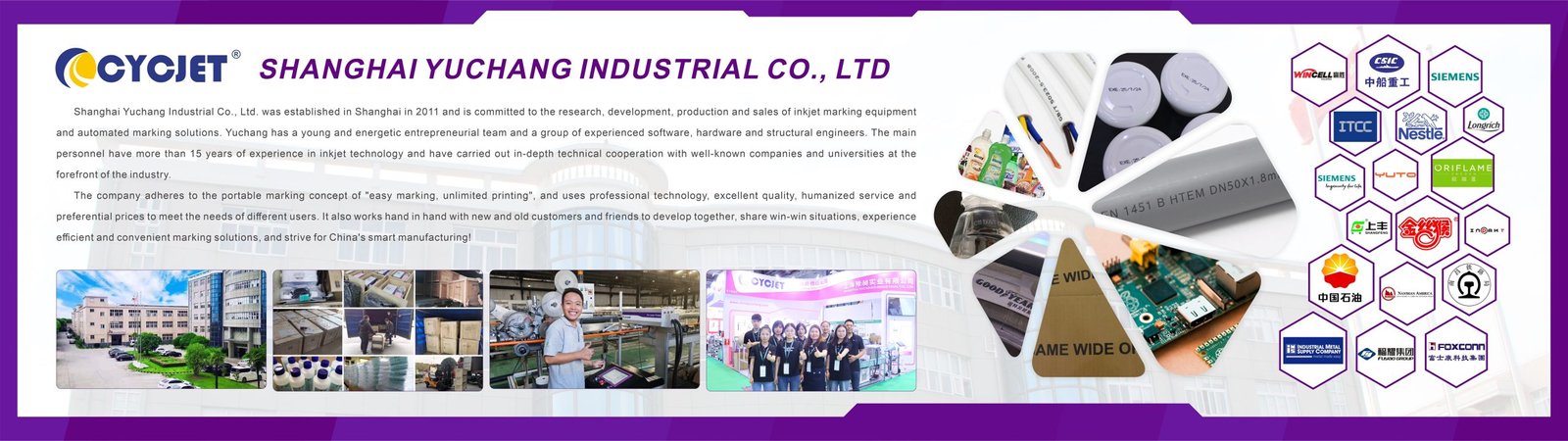 CYCJET is the brand name of Yuchang Industrial Company Limited. As a manufacturer, CYCJET have more than 20 years of experience for R& D different types of handheld inkjet printing solution, Laser printing solution, and portable marking solution, High Resolution Printing solution in Shanghai China.